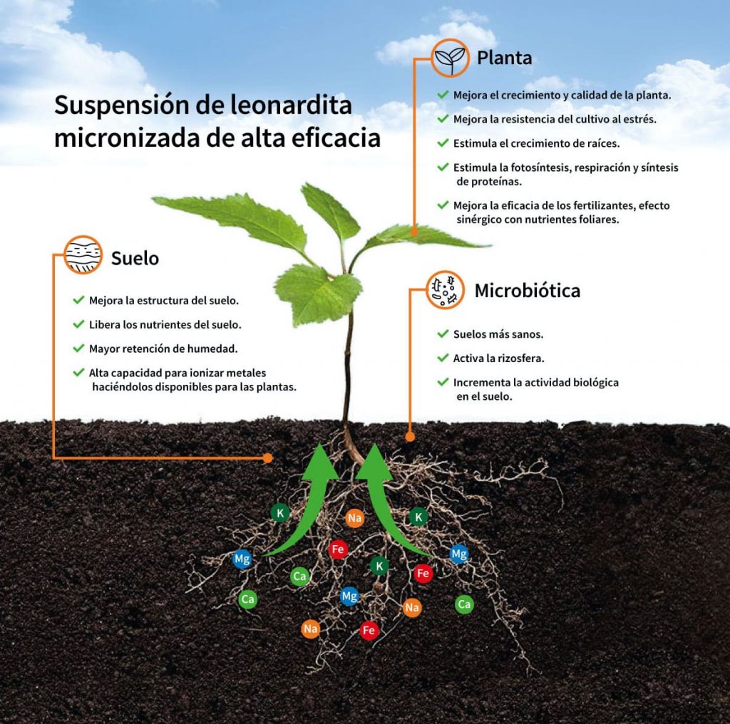 La leonardita facilita la incorporación de material orgánico en el suelo, acelerando su descomposición y aprovechamiento de los nutrientes. El alto contenido de carbón estimula a organismos benéficos que se encuentran en el suelo, su uso continuado mejora la estructura y el contenido de materia orgánica en él. La Leonardita permite un ahorro que se extiende a la muy significativa reducción en las dosis de los fertilizantes comerciales (NPK). Pero lo más importante es su profundo efecto sobre la salud del suelo y la vitalidad del cultivo, hechos que se traducen en rendimientos más abundantes y cosechas sanas y de óptima calidad.